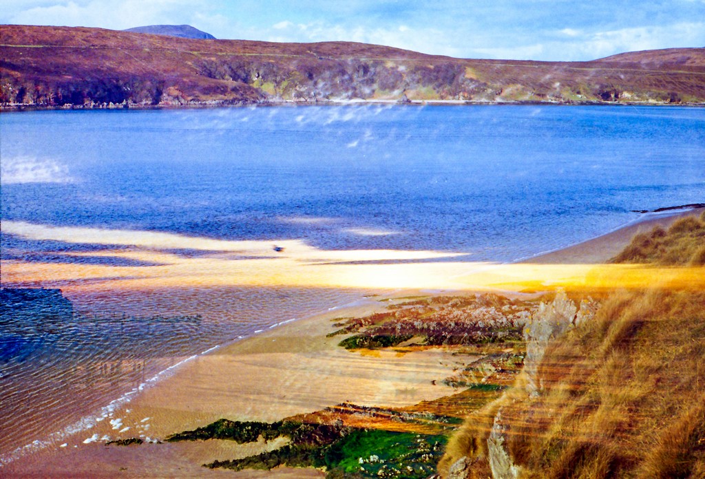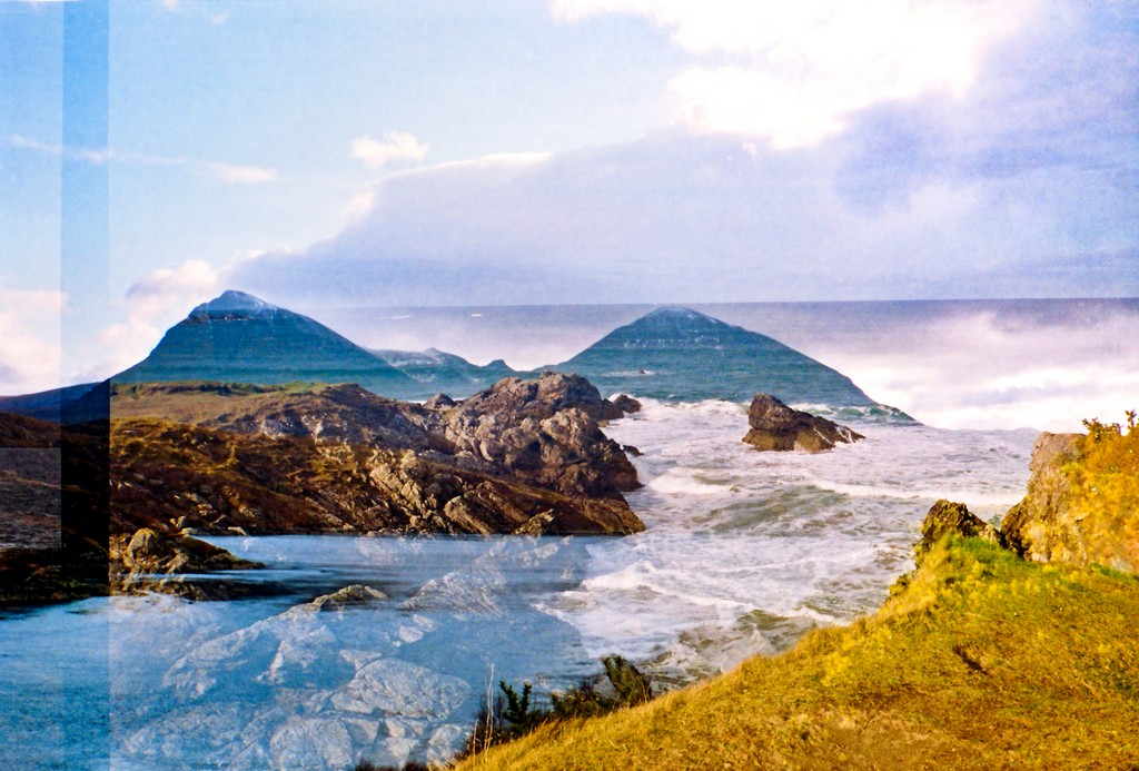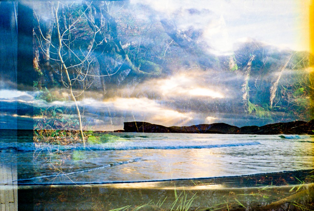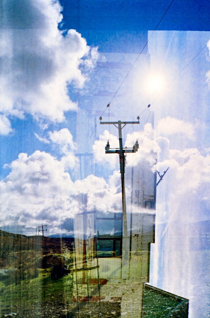 These images were made using a Chinon Auto GLX, an automatic compact camera I was gifted as a child when I started to really get into photography. After taking a roll of pictures in the North West Highlands, when the film auto-rewound there was a tempting piece of film sticking out from the canister – so I loaded it back in and re-shot the same film again. Only this time, the landscape had changed….